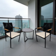 This outdoor dining set is a great choice for anyone who loves to dine al fresco. It consists of a round wooden table and four woven chairs, all made of durable and weather-resistant materials. The table showcases its natural wood grain and color, creating a warm and rustic look. The chairs feature black woven backs and armrests that contrast nicely with the wood and add a touch of modern elegance. The chairs also come with light-colored cushions that provide comfort and style. The dining set is perfect for patios, gardens, or poolside, as it can create a cozy and inviting atmosphere for any occasion. Whether you want to enjoy a family meal, a romantic dinner, or a casual gathering with friends, this outdoor dining set will make it a memorable experience.