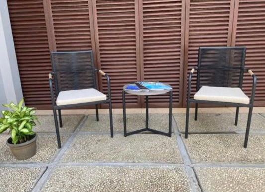 Tables in weather resistant material. Teak wood table, synthetic polywood and aluminium dining table in black or white. Outdoor side table for balcony set.