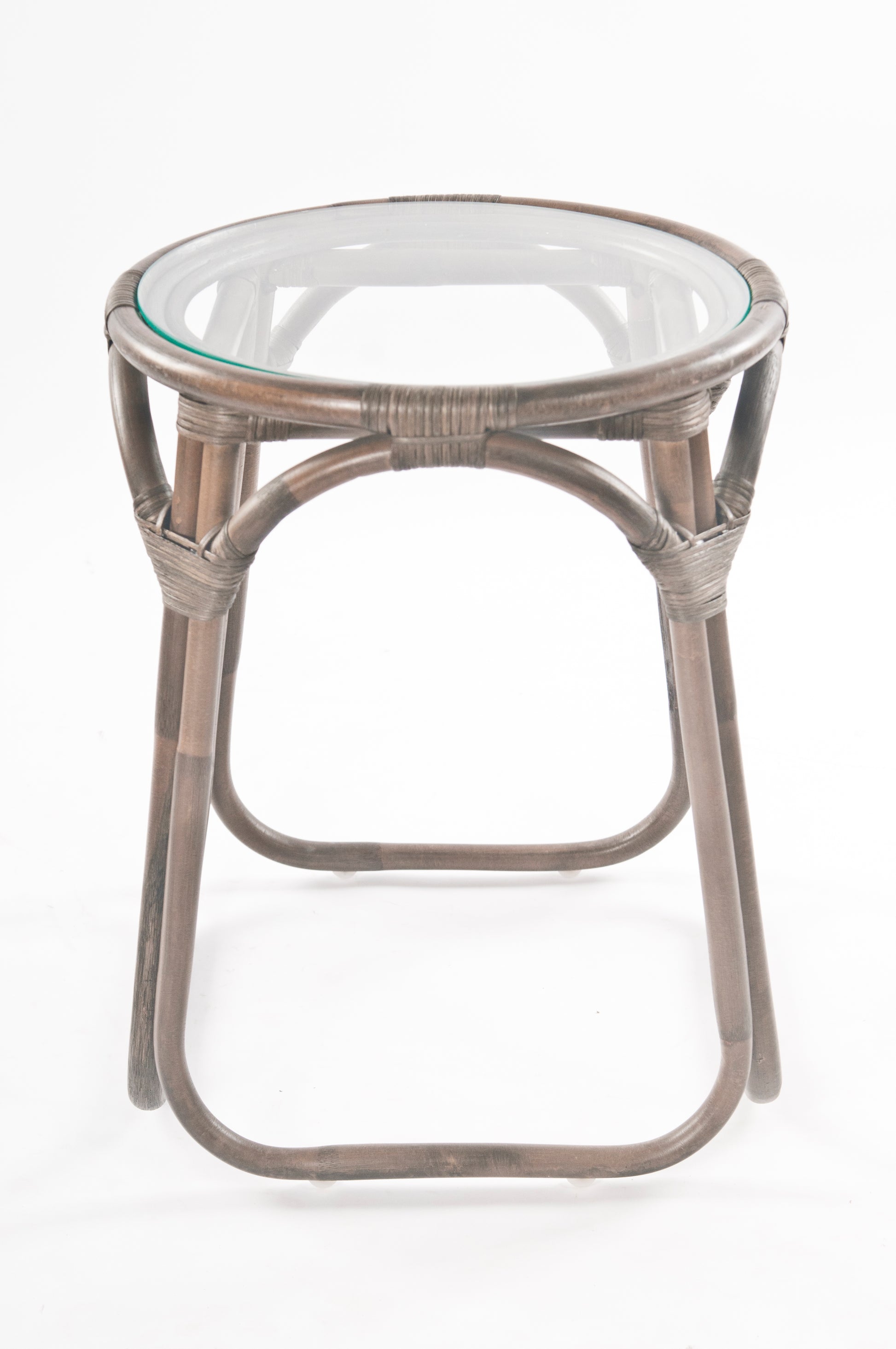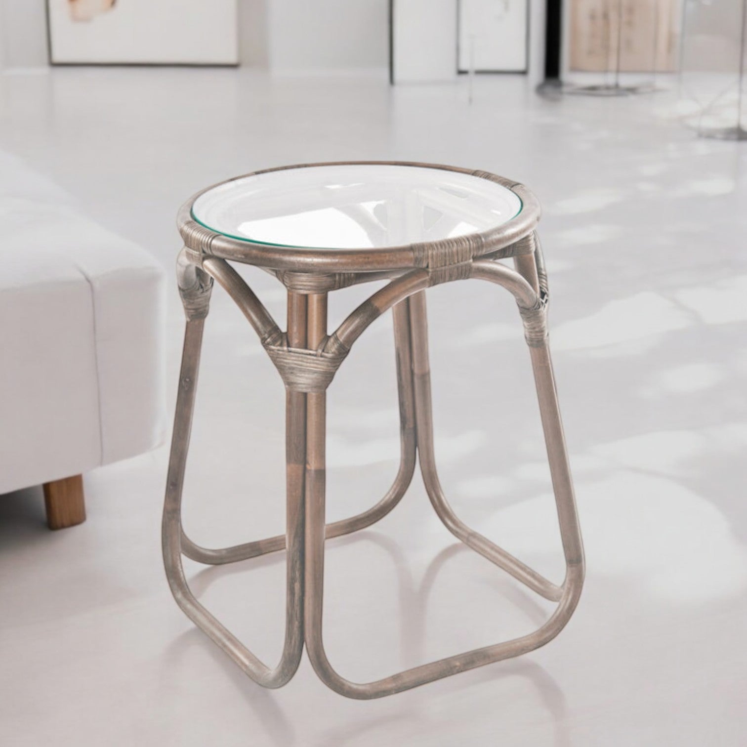 Minimalist rattan side table with glass insert top.