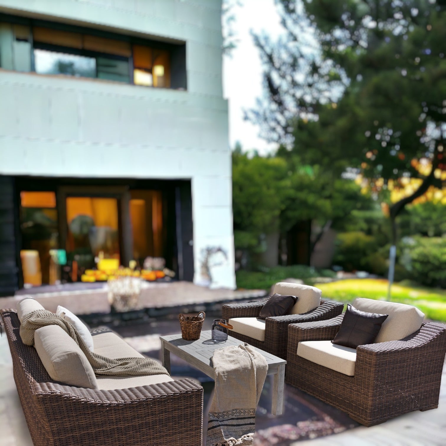 Beautiful sofa set in synthetic wicker, can be used indoor as well as outdoor. Natural looking synthetic material that is easy to maintain and long lasting.